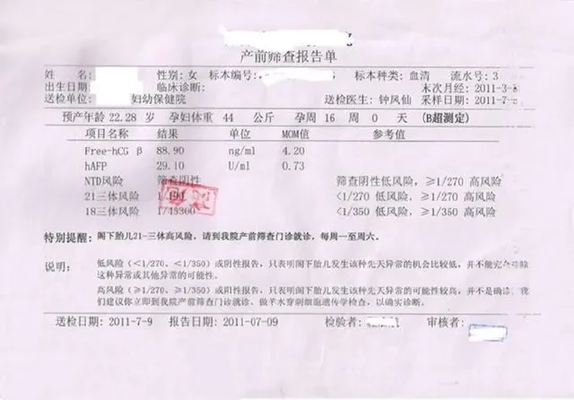 下图是一份唐氏筛查结果高危报告单,各地的报告单形式可能会有变化,仅供参考。