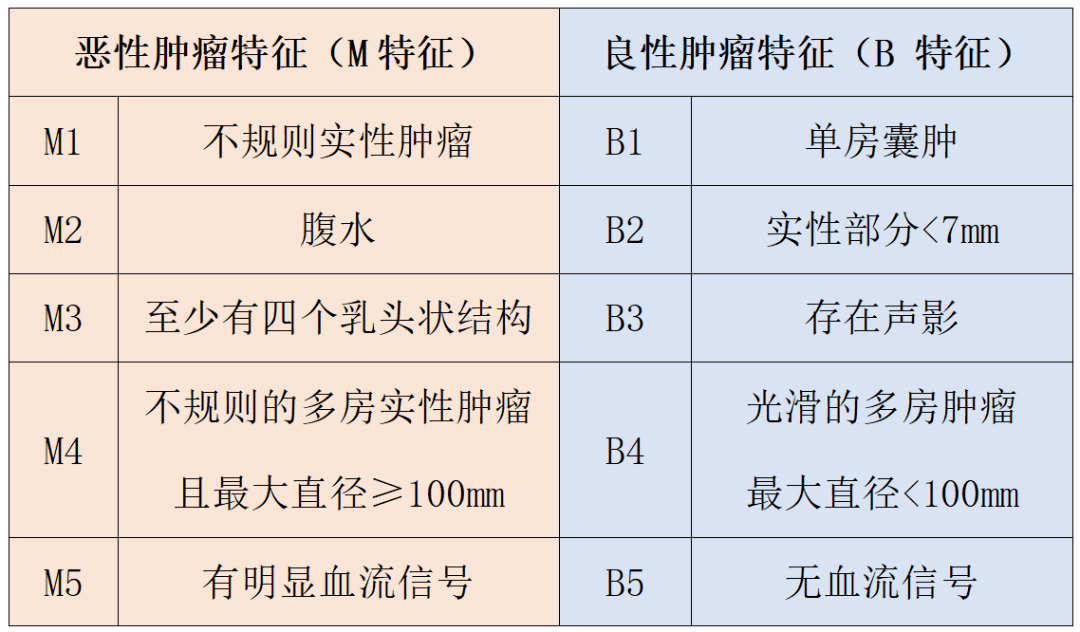 正如上文所说,由于B超下发现的毕竟只是一个影像,所以很多时候并不能判断囊肿的性质,还需要进一步随访 或检查才能判断。国际卵巢肿瘤分析组织(IOTA)将卵巢肿瘤的超声描述方法标准化,在以下识别卵巢肿瘤良恶性 的10个简单特征中,若卵巢肿瘤含有至少一个恶性肿瘤特征(M特征)而没有良性肿瘤特征(B 特征),则卵巢肿 瘤被分类为恶性肿瘤。