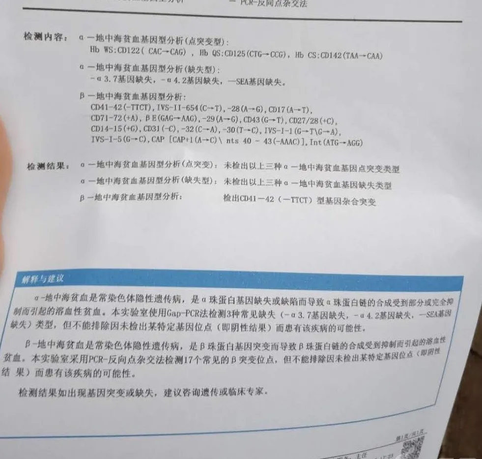检查结果出来了,她是地中海基因携带者,她老公是正常的。自从检测出这些问题后,她明