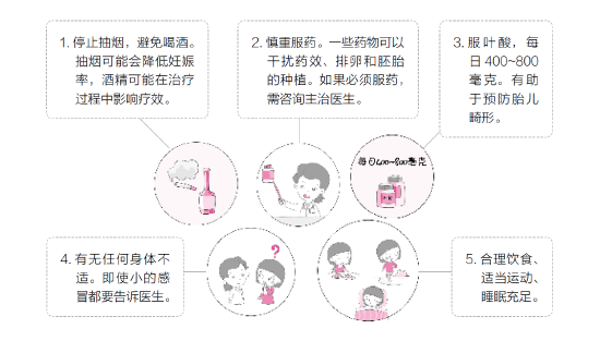 如果你需要进行辅助治疗,就要做好时间、身体及心理上的准备工作。夫妻二人要沟通好,一起参与;确保你的工作与任何检查、治疗不冲突,避免因忙乱而弄得自己压力很大;饮食要健康,使你的身体更强壮;每周至少进行3次30分钟快走,有助于血液循环;保持良好的情绪,做好充分的心理准备。