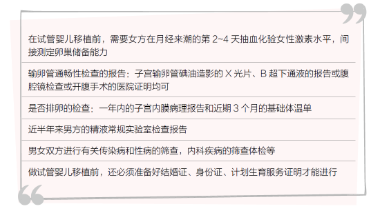 上述资料齐全后,可到医院就诊。正式进入周期前,在预期月经来潮前10天就诊,再次妇科检查,进行试验移植,探测子宫腔深度及移植胚胎时导管方向。
