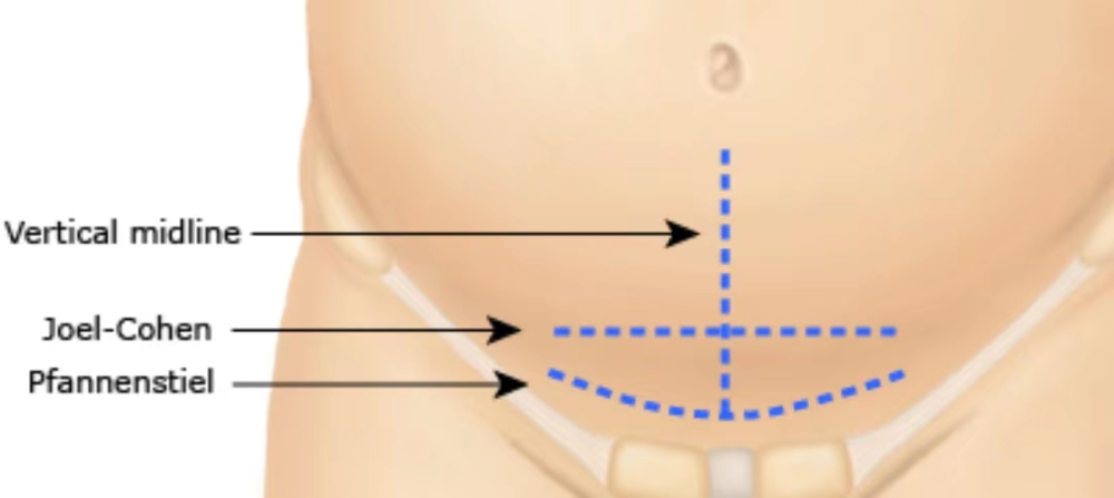 剖宫产的2种常用横切口是Pfannenstiel型和Joel-Cohen型切口(如Misgav Ladach)(下图)。