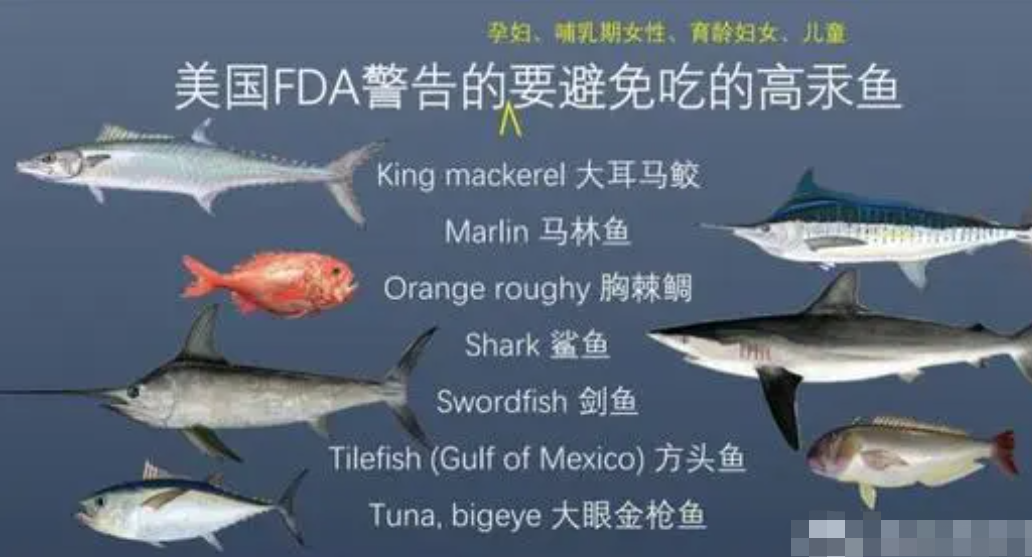 一般大型的鱼汞含量会更高,比如说鲨鱼剑鱼和大眼金枪鱼,这些鱼因为是肉食的鱼类,它 们会吃一些小鱼,小鱼身上的汞会聚集到它们身体,所以它们身上的汞含量会更高。