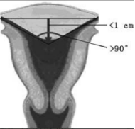 弓形子宫在各文献中的常见定义为子宫外形基本正常,宫底外形无切迹,宫腔底部内膜呈弧形内凹,内凹深度一般<1 cm,两侧内膜夹角>90°,见图1。