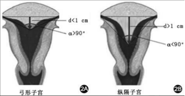 若α角为钝角、d<1 cm则为弓形子宫,见图2A;若α角为锐角、d>1 cm则为纵隔子宫,见图2B。