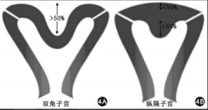 (4)ESHRE定义的双角子宫和纵隔子宫是,若宫底浆膜层内陷<宫壁厚度的50%且宫腔内隔厚度>宫壁厚度的50%,则定为纵隔子宫;若宫底浆膜层内陷>宫壁厚度的50%,则为双角子宫,见图4。