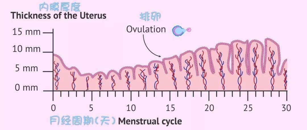 在整个月经周期中,随着体内雌孕激素由低到高的增长,子宫内膜也由薄到厚的生长。如果没有怀孕,子宫内膜脱落,月经来潮。