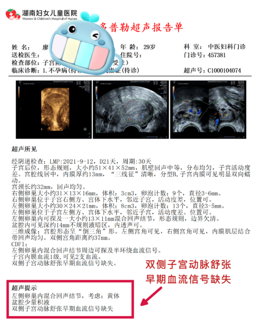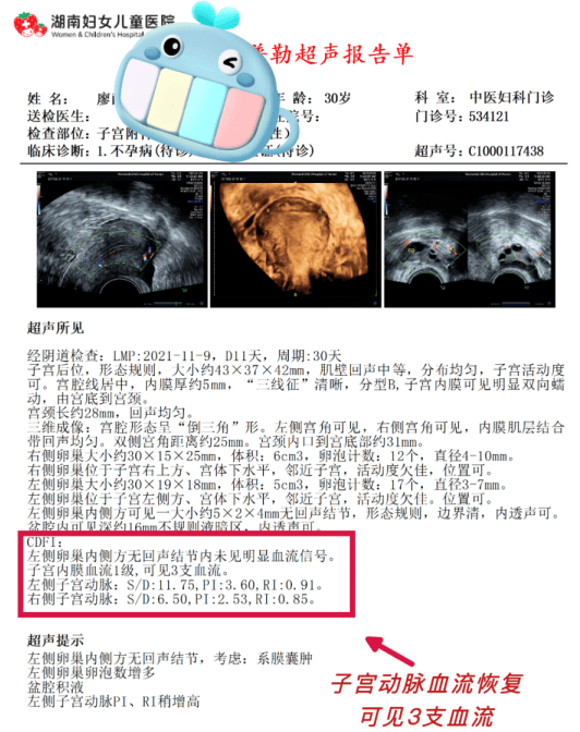 2个月后复查B超,菲菲内膜血流及子宫动脉血流恢复,次月安排再次移植囊胚,配合中医补肾健脾促进胚胎着床, 终于顺利着床。