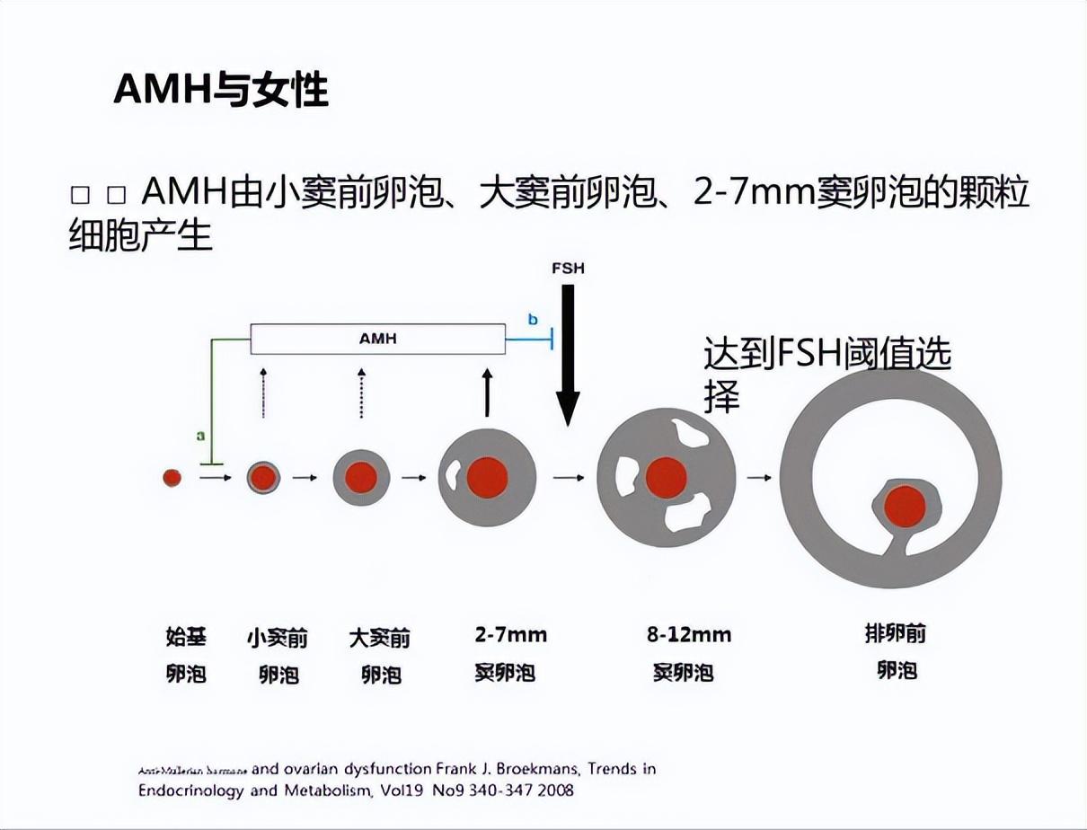 AMH是一种双体醣化蛋白,由卵巢的颗粒细胞所产生,在青春期性成熟时分泌量最高,之后就慢慢下降。血液中AMH值不随月经周期、有无怀孕、有无服用避孕药等而变动,在任何时间抽血检查数值都稳定。所以说AMH在月经周期的任何一天皆可抽血检查,也不用禁食,报告也颇具参考价值。