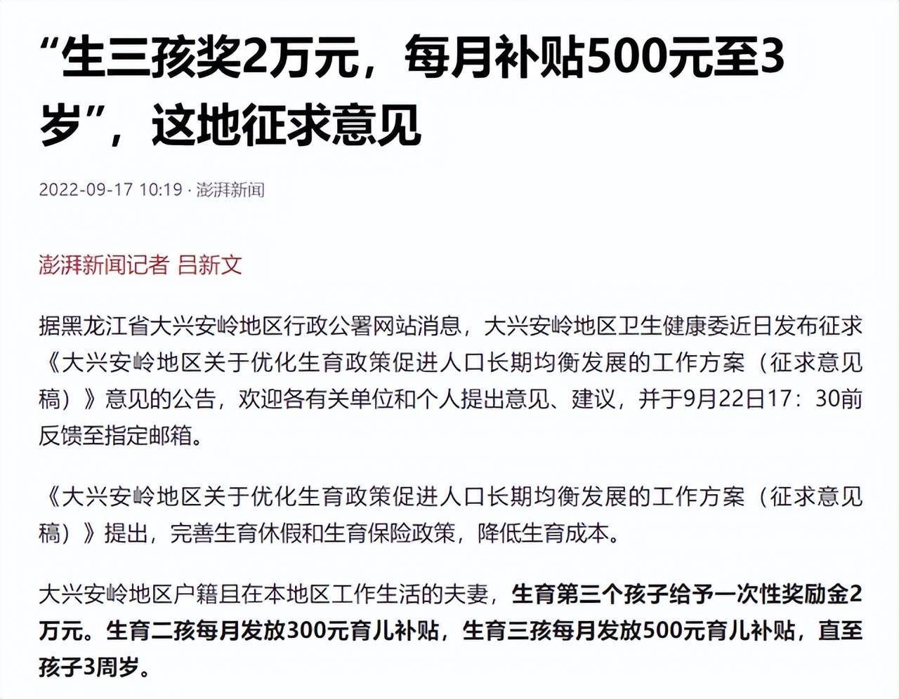 大兴安岭地区户籍且在本地区工作生活的夫妻,生育第3个孩子给予一次性奖励金2万块,生育二孩每月发放300元育儿补贴,生育三 孩,每月发放500元育儿补贴,一直到孩子三岁。也就是说生育三孩的可以领38,000元。