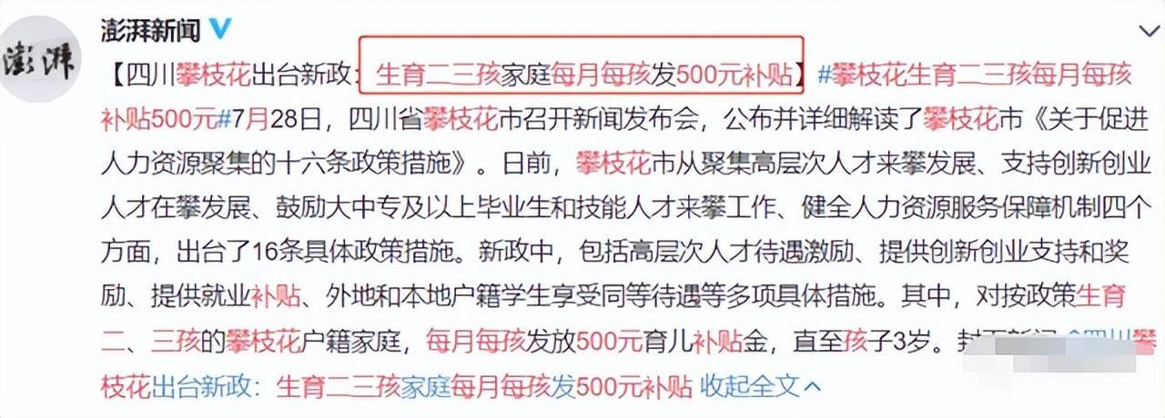 比如四川攀枝花在2021年7月份就开始对生育二胎三胎的攀枝花户籍家庭,每月每个孩子发放500元,一直补到孩子三岁。也就是如 果你要生二胎三胎的话可以领18000块钱。