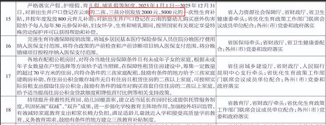 云南明确2023年1月1日-2025年12月31日,对新出生户口登记在云南的二孩、三孩发放2000、5000元一次性生育补贴,每 年还可以领800元的婴儿补助,也就是三胎可以领将近8000块钱!