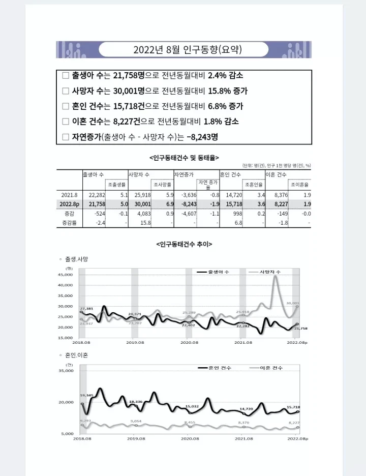 韩联社10月26日报道,韩国统计厅10月26日发布的《8月人口动向》显示,韩国今年8月出生人口创历年同月新低,死亡人口创历年同月新高,今年前8个月人口累计自然减少近8万人。