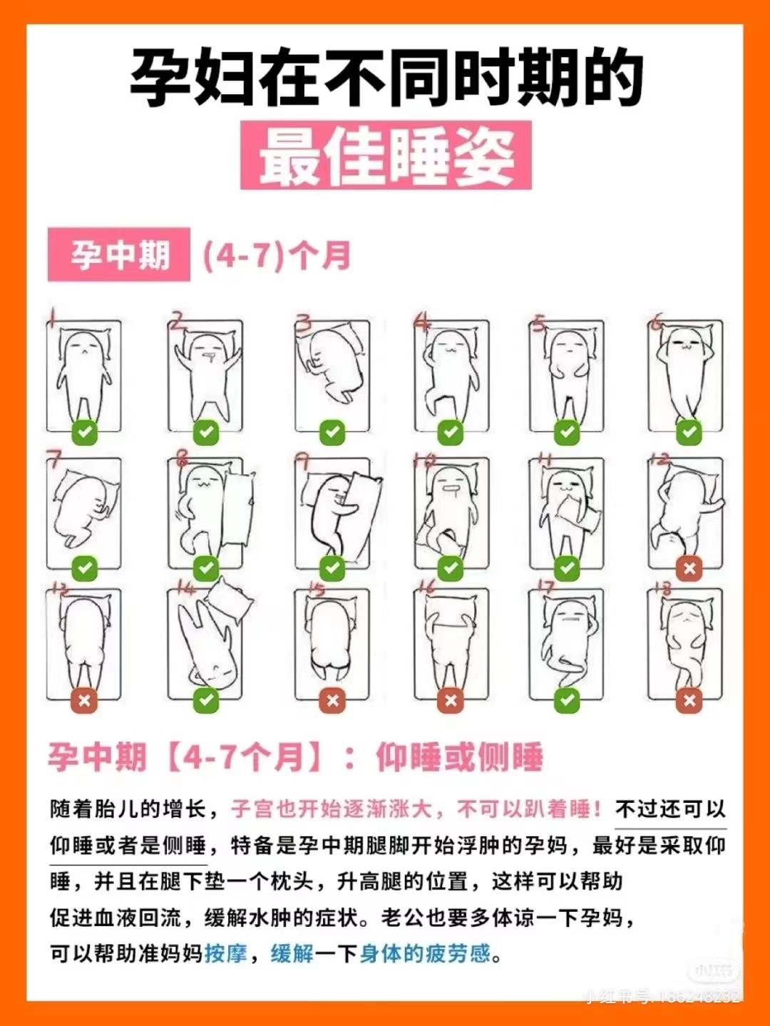 仰睡或侧睡孕中期孕妈子宫会逐渐被胎儿撑大,最好是采取仰睡或侧睡,在大腿两侧或小腿下放上垫枕,促进血液流通,缓解水肿的症状。
