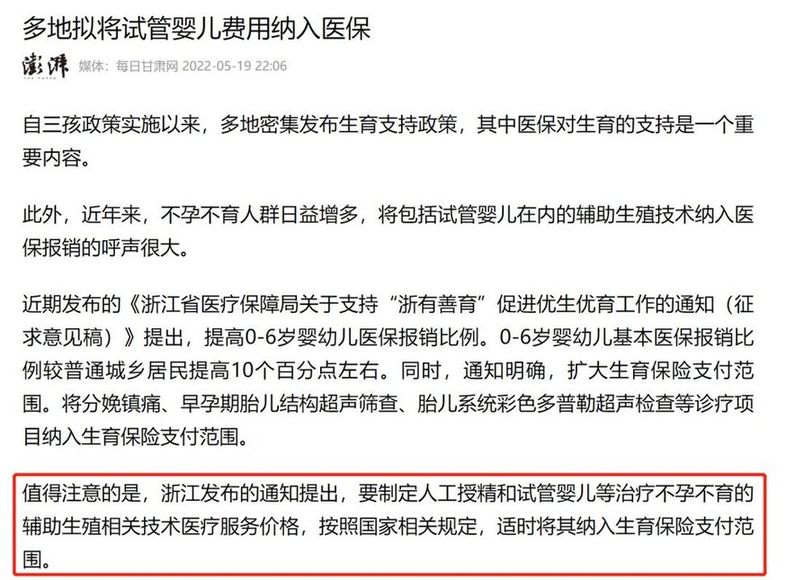 最近有比较好的消息,浙江省发出意见征求稿,准备把试管婴儿的费用纳到医保报销范畴。